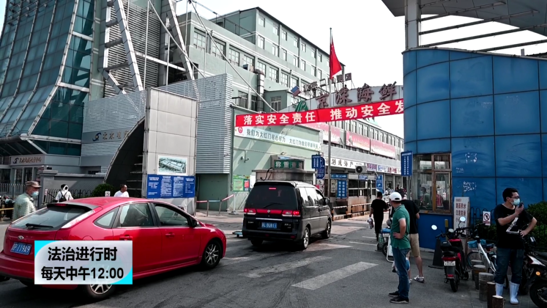 8月6日上午9点,丰台区市场监管局的执法人员来到了大红门京深海鲜批发市场。市场采取了人车分流,每一辆进场车辆都需要消杀登记测温。